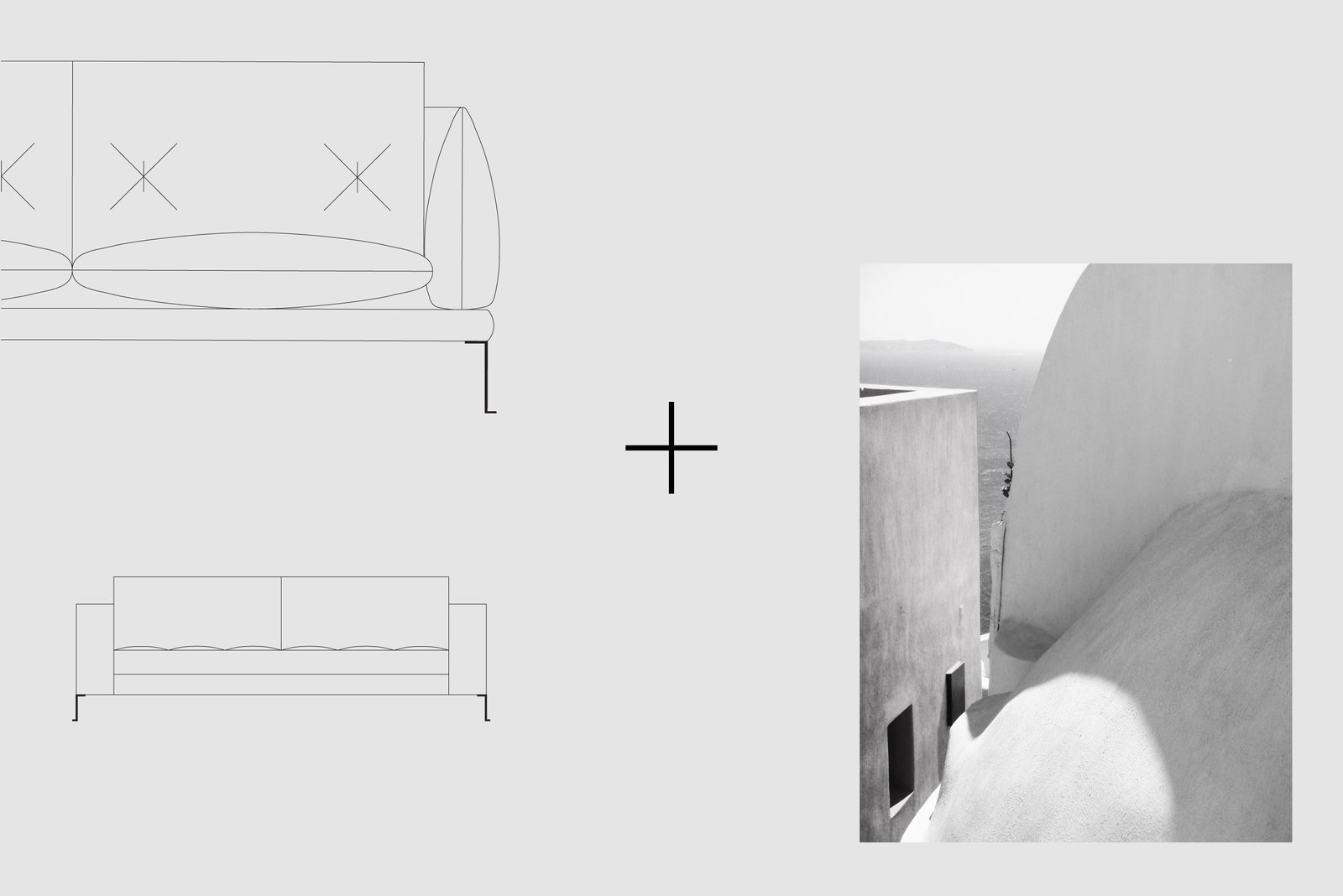 The logo is a type hybrid combination of Latin and Greek letters inspired by the designers’ work influence, the Greek islands. The symbol also represents the particular design signature of the sofas’ legs collection. The colours of the visual identity are black, off-white and dark grey which give space to the bold colours of the furniture collection to emerge.