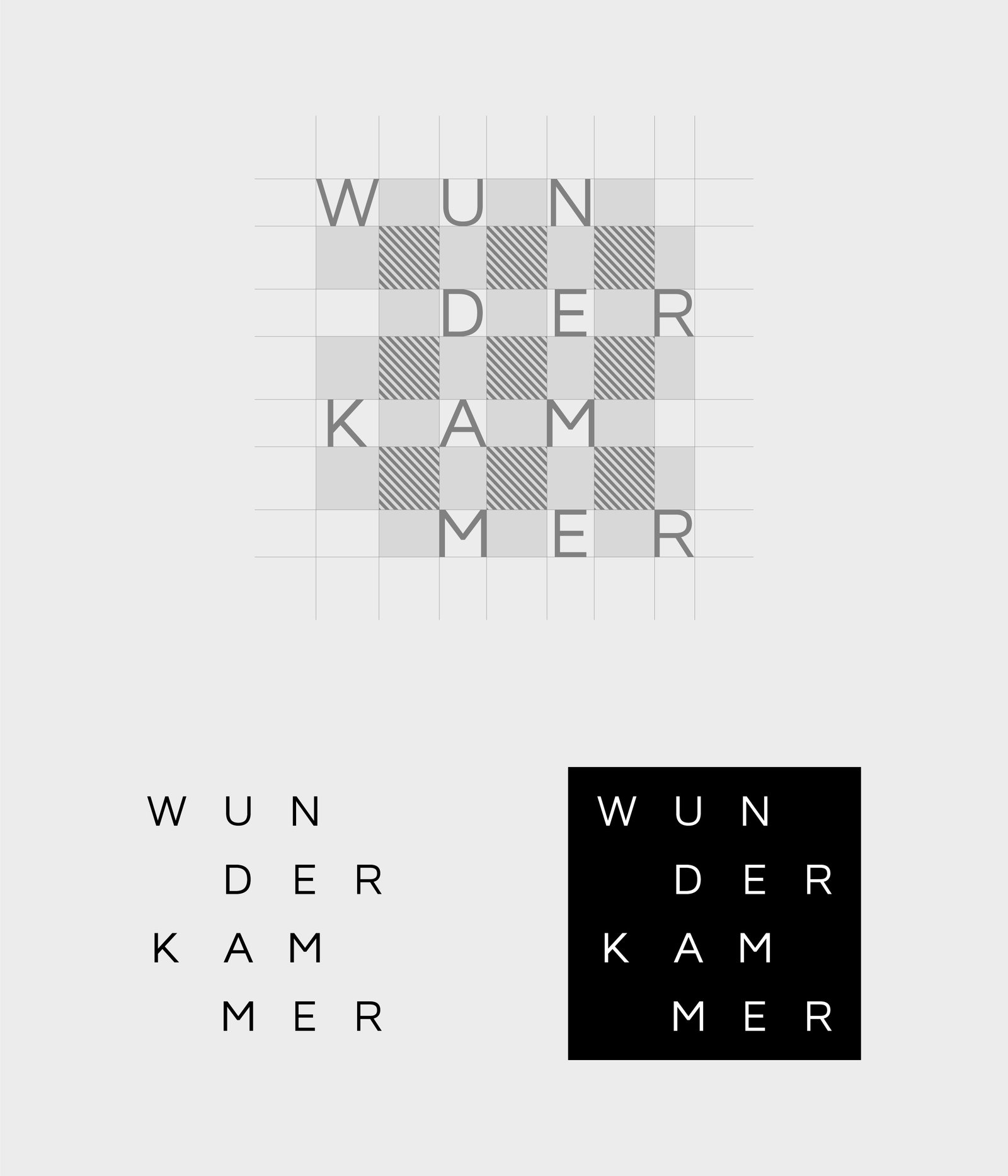 The visual identity is inspired by the meaning of the word Wunderkammer, the cabinet of curiosities. The typographic logo represents the letters of the word in a square grid as the curiosities exhibited in the cabinet.